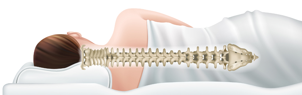 During Pilates class, when lying on your side, you should support your head and stretch your top-most hip towards your feet to make your spine horizontal, as is often shown in mattress advertisements, like this image.